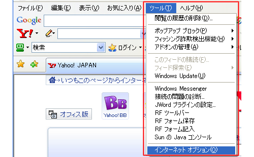 (1)[ツール]メニューから[インターネットオプション]を選択してください。